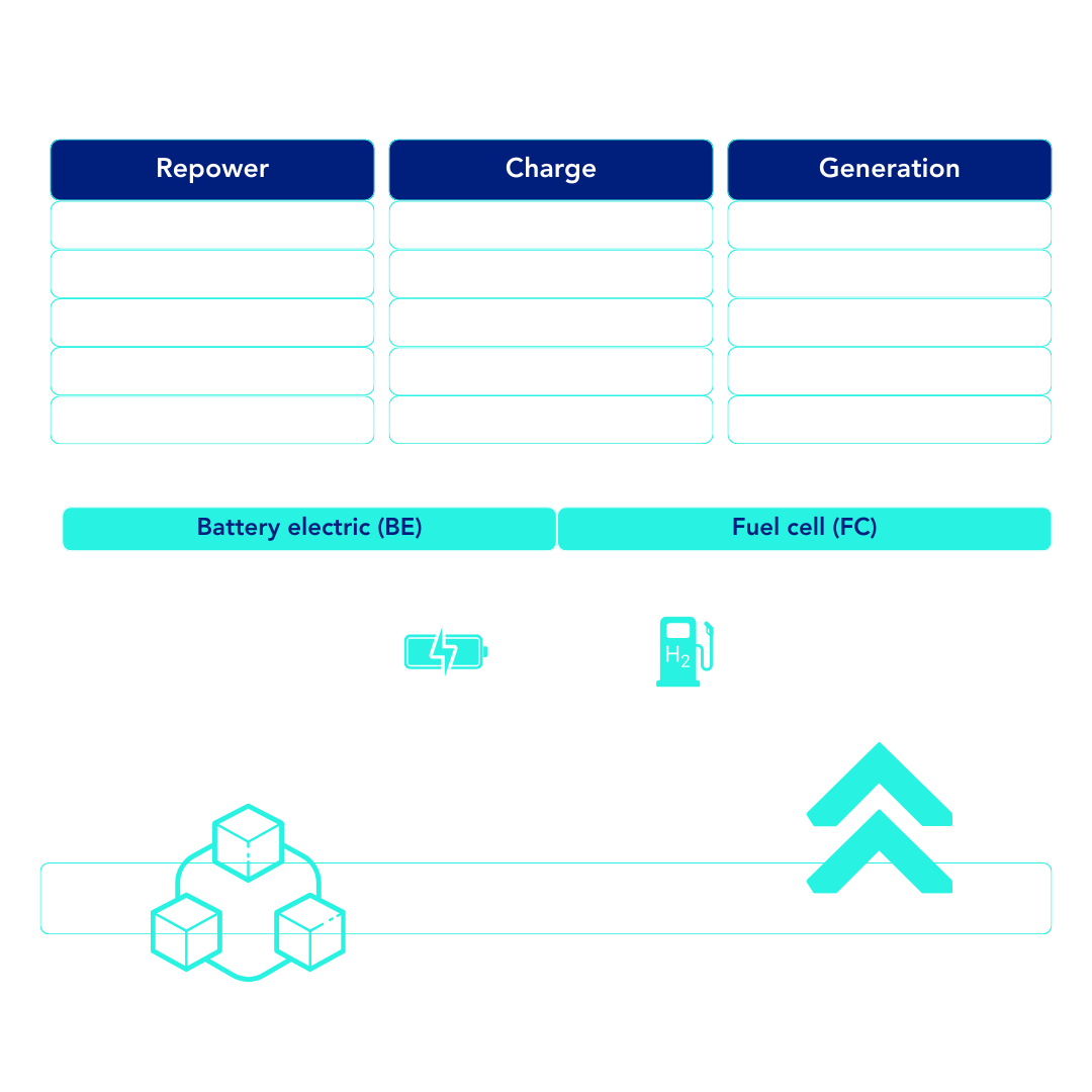 Electricity & hydrogen production modules. EV transition adding pressure on electrical grids. Modular power generation options. Adapted based on location and output requirements.